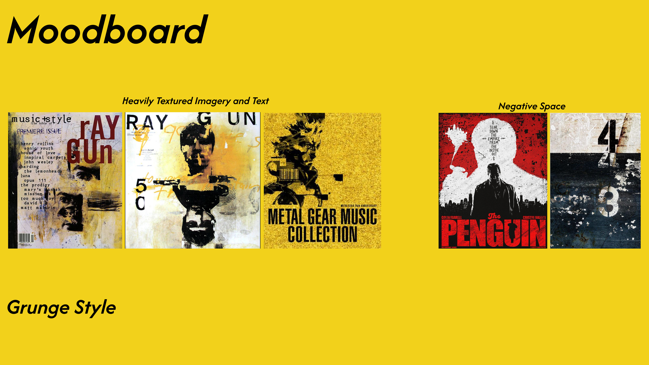A style reminiscent to that of grunge, by utilizing many layers of texturing to build visual interest and grit the combines with a limited color palette to communicate a slight edge into the design.
