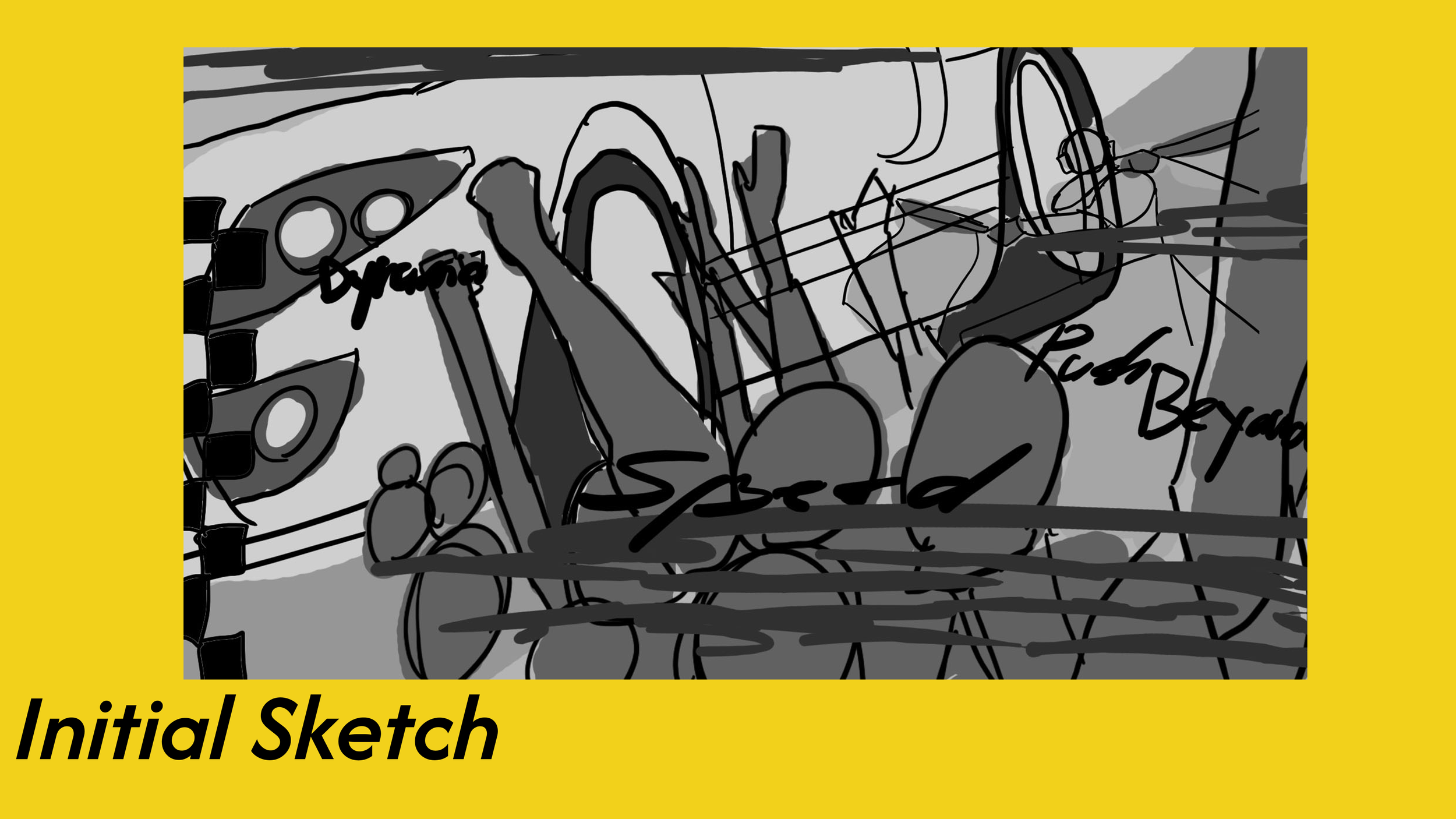 The first sketch was meant to board out the largest shapes into the composition, how they play off of one another, playing with angles of how objects are placed in order to create an illusion of speed, which once again reflects the emotional direction meant to be conveyed through the final style frame.